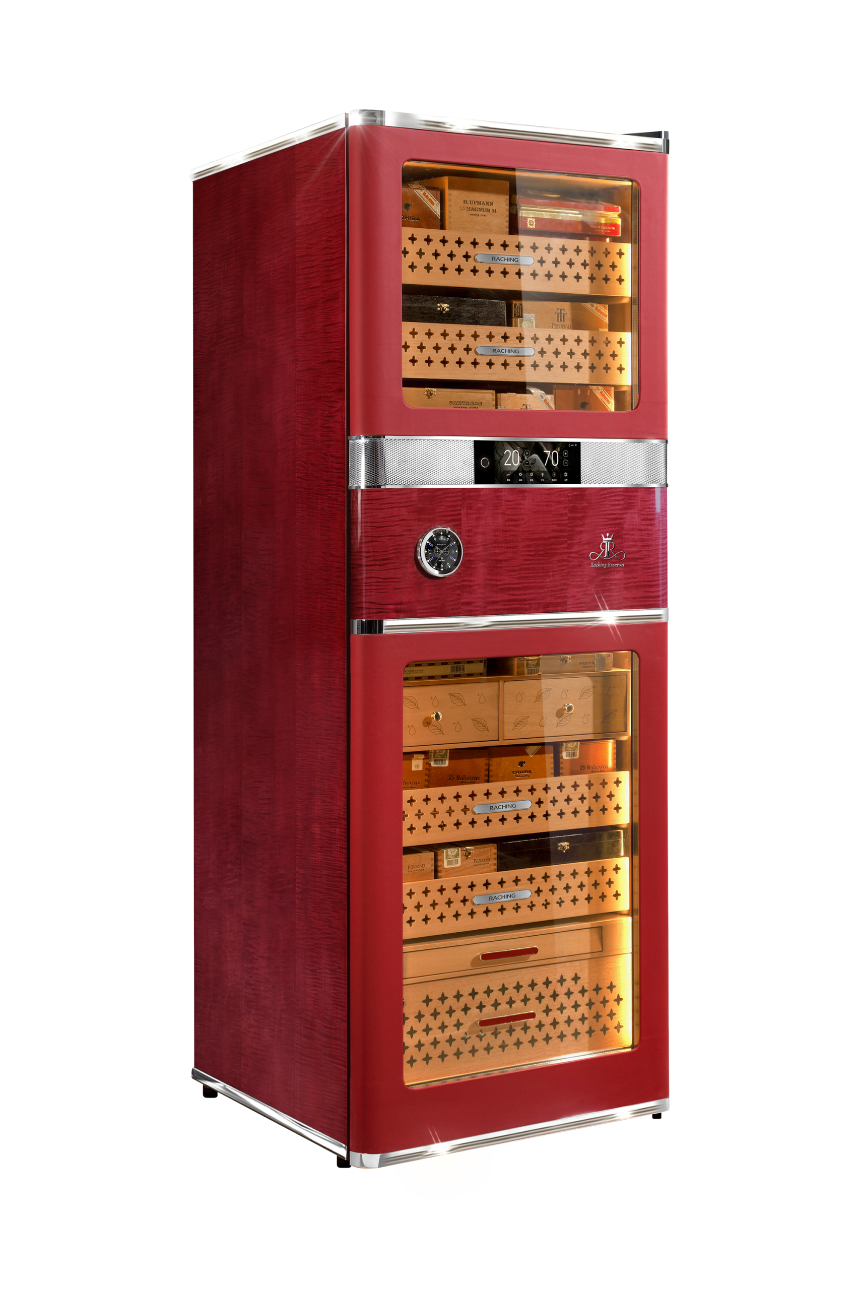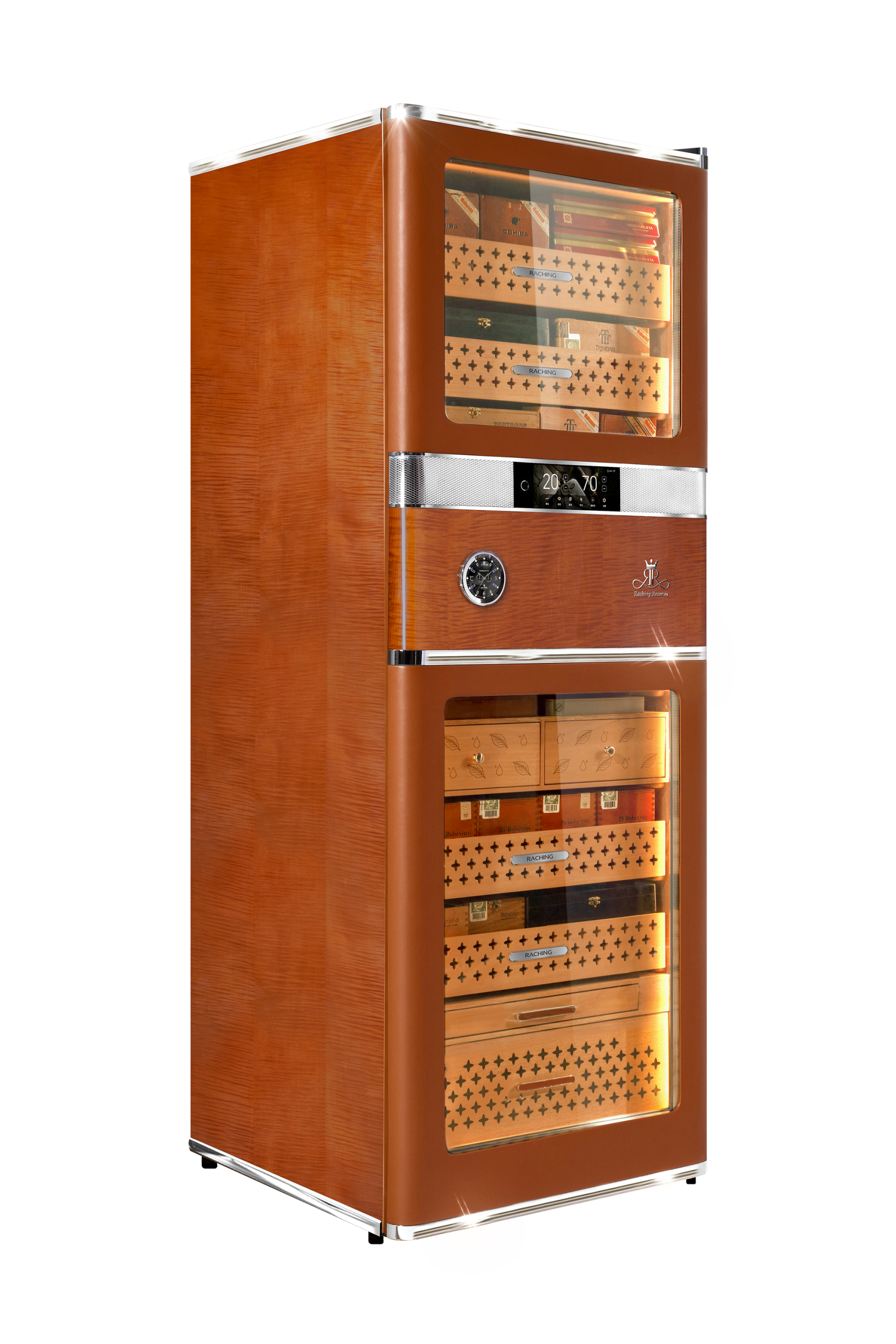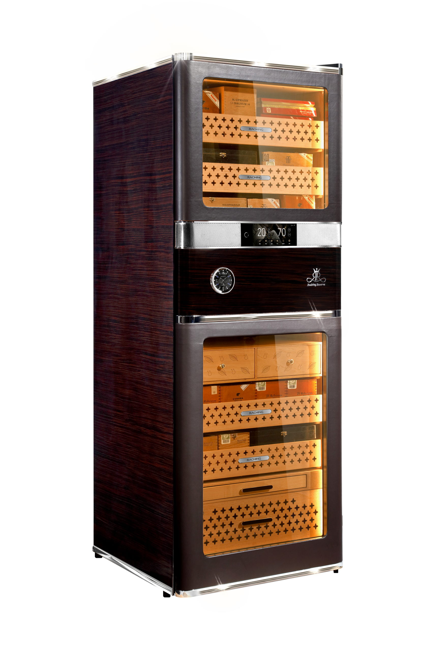 The Raching RR980 Cigar Humidor is a flagship electronic humidor designed for cigar aficionados, collectors, lounges, and upscale environments seeking exceptional cigar preservation and show-stopping design. Built around advanced climate and humidity systems, this luxury cabinet ensures a precise, stable internal environment (humidity 60-75 % ±1, temperature 15 °C–22 °C) that protects the integrity and flavor of your cigars over long-term storage.